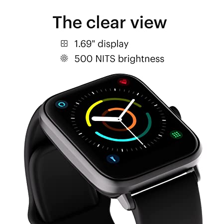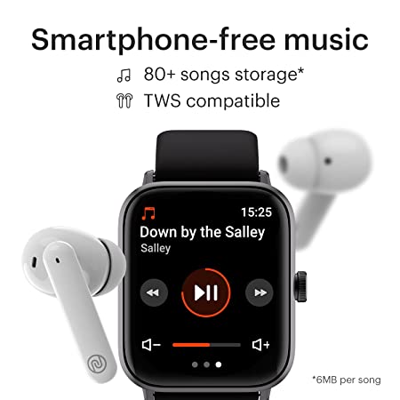 | Special Features | • BT Calling • Skin Temp • Alexa, voice responses • TWS/Neckband pairing • Music Storage and playback • Ambient noise detection • Fast charge- 30 mins full charge • 100 sports mode • 5 ATM water resistant • 1.69” display with 500 nits brightness • 150+ customizable watch faces |