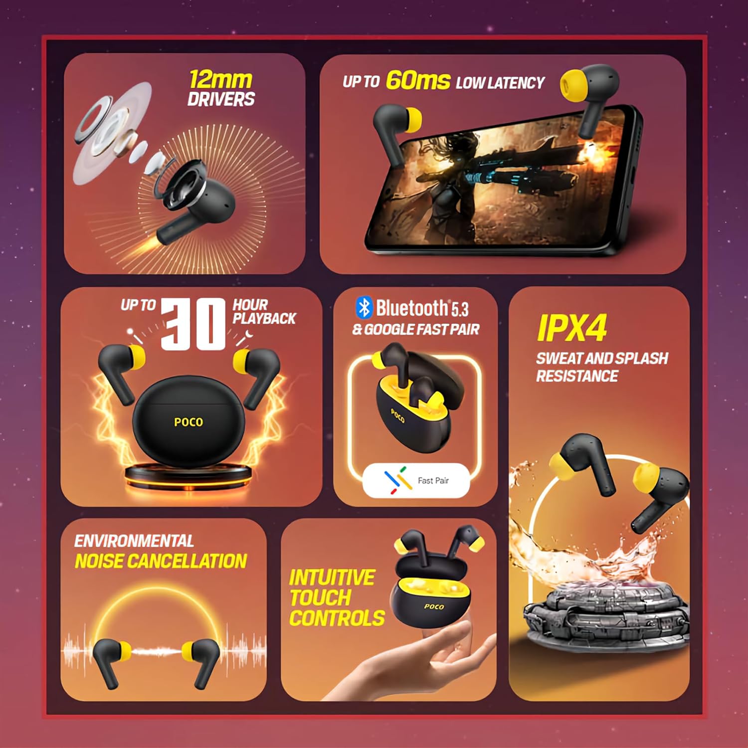 POCO Pods with 30 Hour Playback, 12mm Drivers, 60ms Latency, Fast Charging & ENC Bluetooth Headset (Midnight Groove, True Wireless)