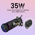 - RGB LED Lights: With these multipurpose party speakers, you can unleash 35W of rich sound and captivating 3-mode RGB lighting. Transform any space, from intimate gatherings to lively parties, with a dynamic light show that complements your music.