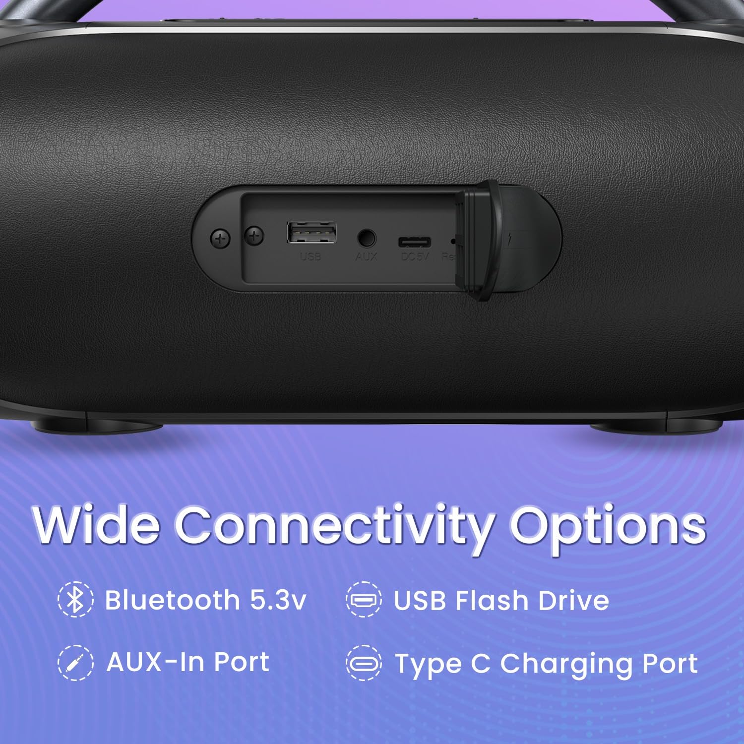 - EFFORTLESS PAIRING: Connect your devices to the speaker via a wide range of options for uninterrupted, HQ sound. The speaker has Bluetooth 5.3v, an AUX-In Slot, & a USB Flash Drive to give you a versatile and enjoyable listening experience.